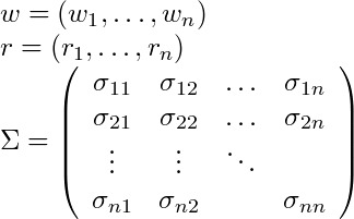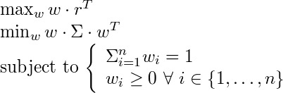 where w is the vector of shares invested in each asset, r the vector of the expected returns and Σ the covariance matrix, the problem can be stated as the following two-objectives optimization (maximize return and minimize risk): :