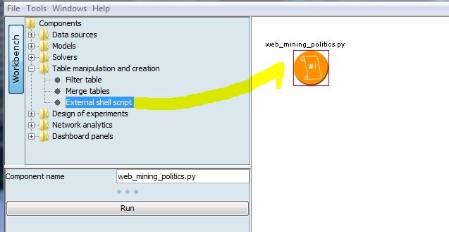 In this demo a LIONoso-compatible Python script mines a website, a public resource like opencongress.org, in order to create a list of representatives of the US congress (112th cycle). This is done by reading the web pages, understanding the format of the content and extracting the relevant information. Using the script is immediate: load it into the workbench, and click run to start it: