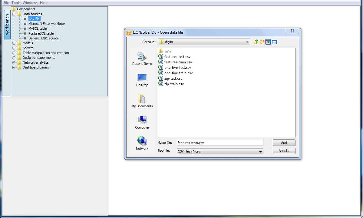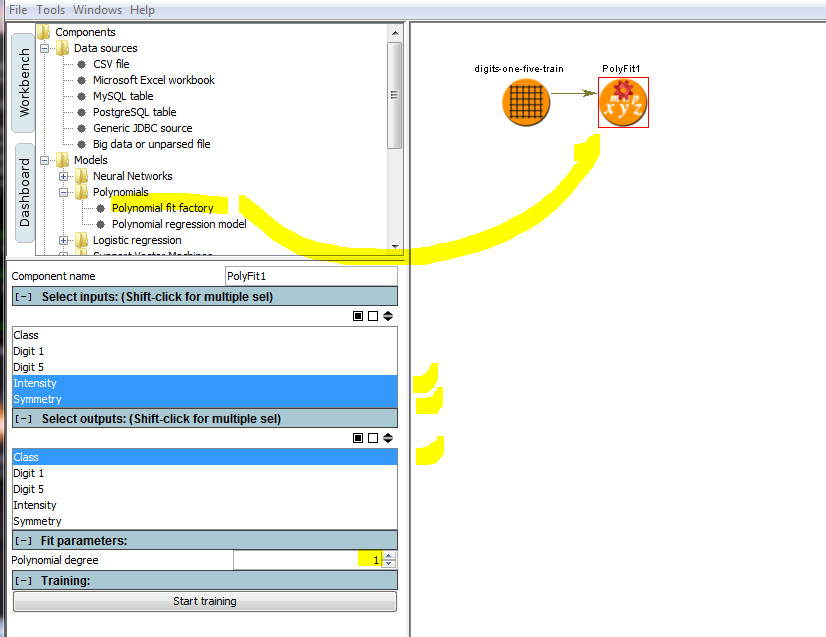 To load data files and the polynomial fit factory (the creator of linear models) drag the corresponding "CSV file" and "polynomial fit factory" to the workbench to the right, and connect them by drawing an arrow. The files one-five-train.csv and one-five-test.csv contain the intensity and symmetry features only for the "one" and "five" digits. Intensity summarizes the overall number of black pixels, symmetry describes how a character is similar to its specular image, as described in [aml]. These data were made available by the neural network group at AT&T research labs (thanks to Yann Le Cunn).