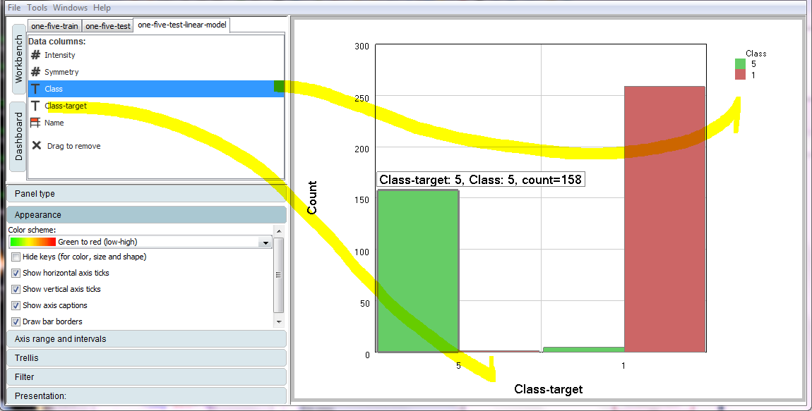 As expected from the sweeper display, the predicted classification (right plot) now corresponds to the linear classification. Additional insight about the linear model, the classification error, the classification statistics, etc. can be obtained by associating the results in the tables with the desired LIONoso plots. The following image show the results for the "one-five-test.csv" files containing test digits: the bar chart with subclasses showing how, in the test file, the desired "Class-target" is classified into the different "Class" values. For example, the limited amount of confusion between digits "1" and "5" is immediately spotted. The experiment with LIONoso is a matter of less than one minute.