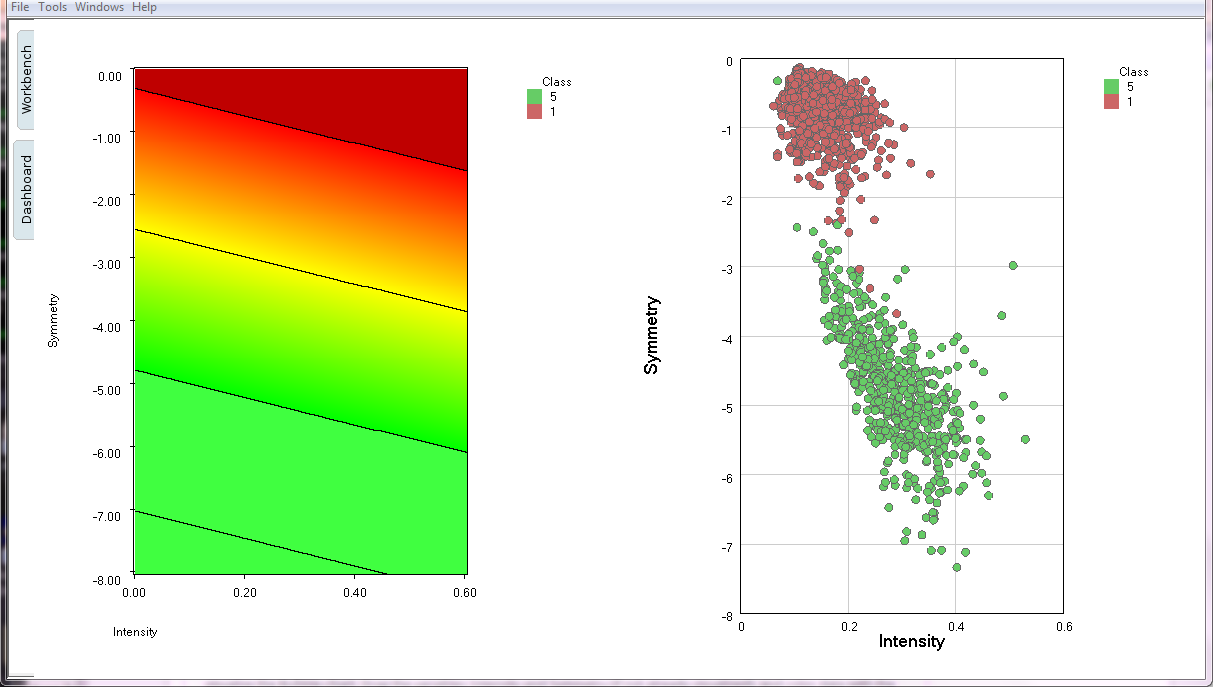 Open the one-five-test.csv file to get the "one-five-test" table. Connect the new table to the linear node to get the predicted output class. Right-click the icon with the prediction table and select "New panel - Bubble". Click on Dashboard to visualize the Bubble-chart. Drag the variables Intensity and Symmetry (if not already visualized), and color data with the Class parameter.