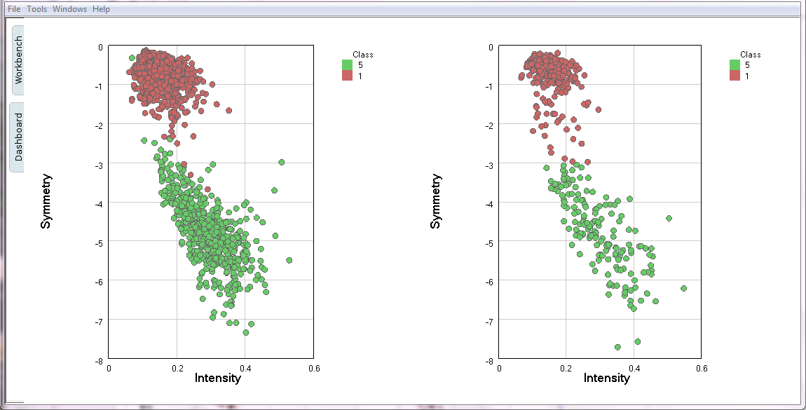 Right-click the icon of the "one-five-train" table and select "New panel - Bubble". Click on Dashboard to visualize the Bubble-chart. Drag the variables Intensity and Symmetry (if not already visualized), and color data with the Class parameter.