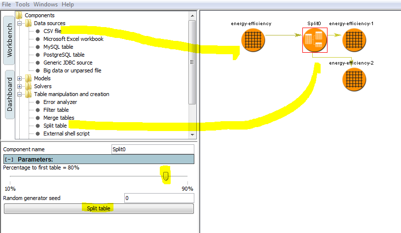 drag the "Split table" node and connect them by drawing an arrow (or drop one on top of the other one).