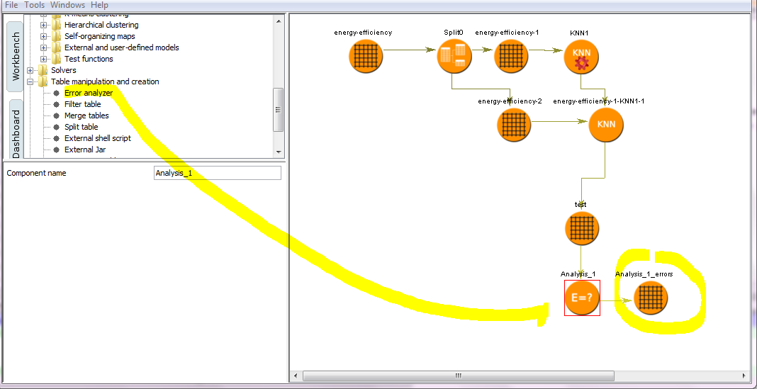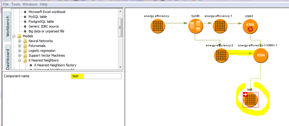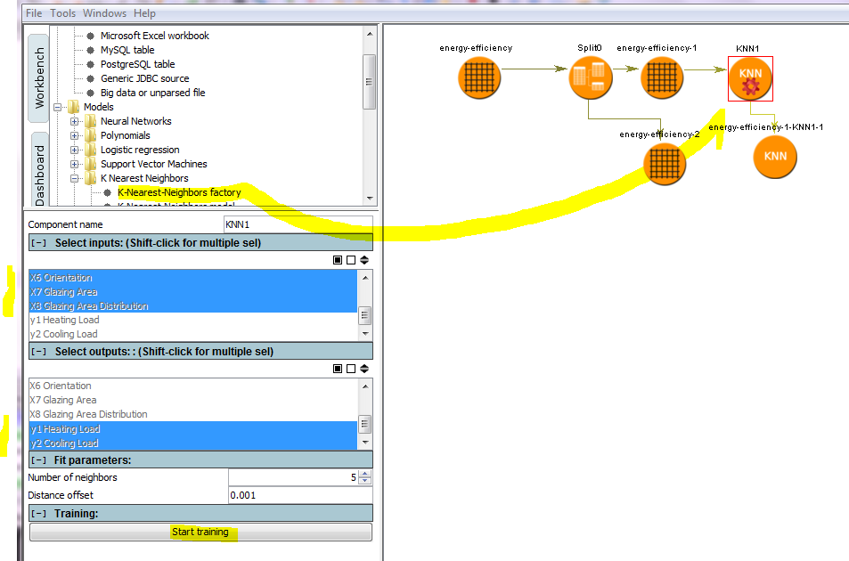 To load the KNN factory (the creator of KNN models) drag the "KNN factory" to the workbench to the right, and connect it to the training file. Click "Start training" to create the KNN model (same icon but no gear symbol).