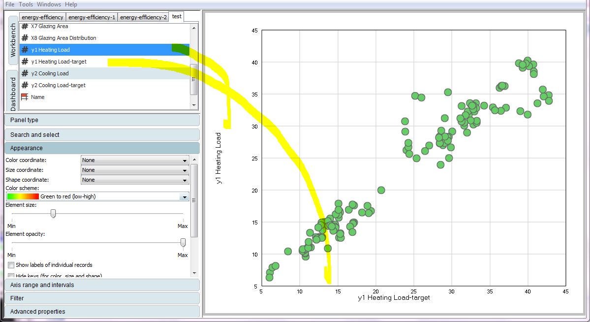 Right-click the icon with the prediction table and select "New panel - Bubble". Click on Dashboard to visualize the Bubble-chart. Drag the variables HeatingLoad-Target (the target value given in the table) and HeatingLoad (the predicted value) if not already visualized.
