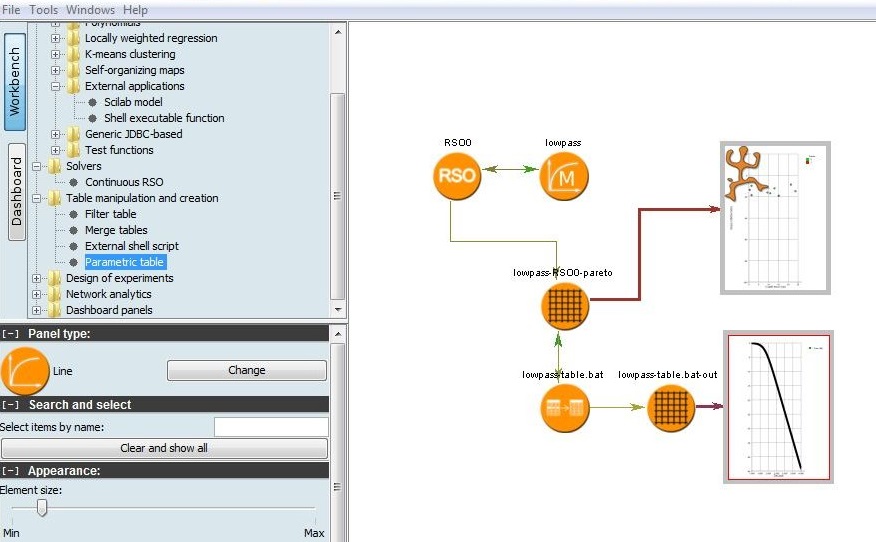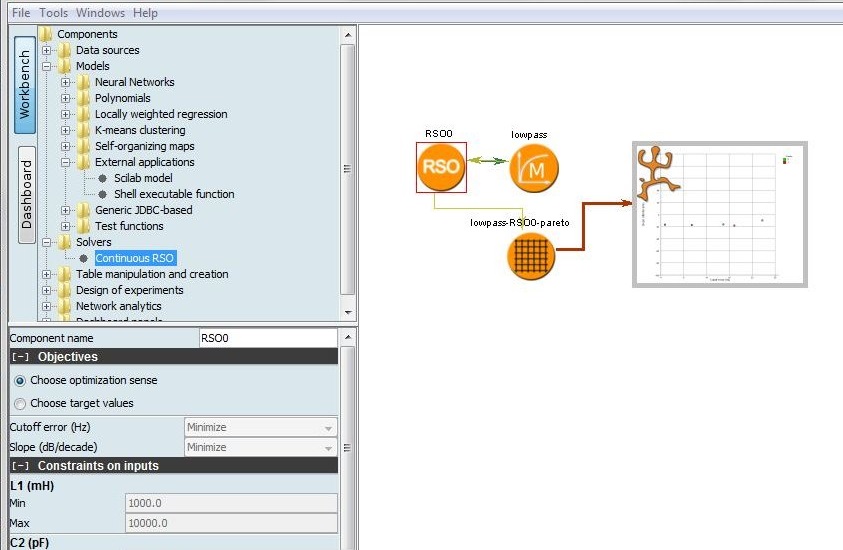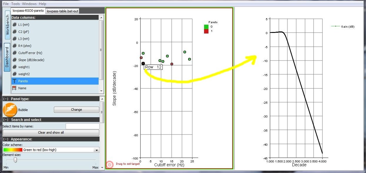 For this problem, visualizing a single solution can be done with the tools of LIONoso, for example by generating tables of the gain as a function of the different frequencies. But there is a more interesting possibility: to visualize different solutions, by clicking on balls in the Pareto-optimal points (the set of non-dominated alternatives). This can be done by the parametric table tool in the Table manipulation and creation folder. When connected to the optimization results table it creates data referring to the particular solution chosen (by clicking on it).